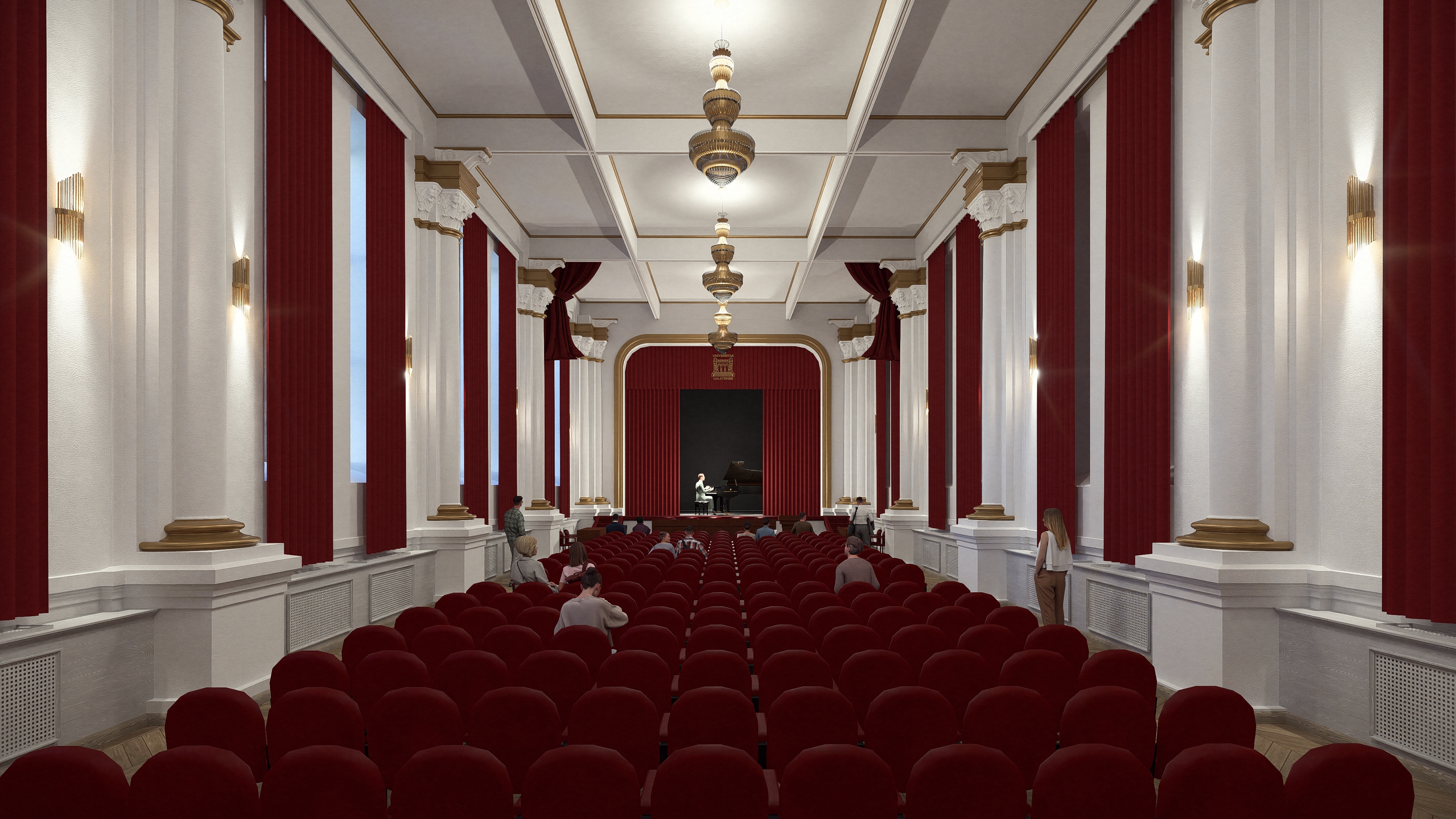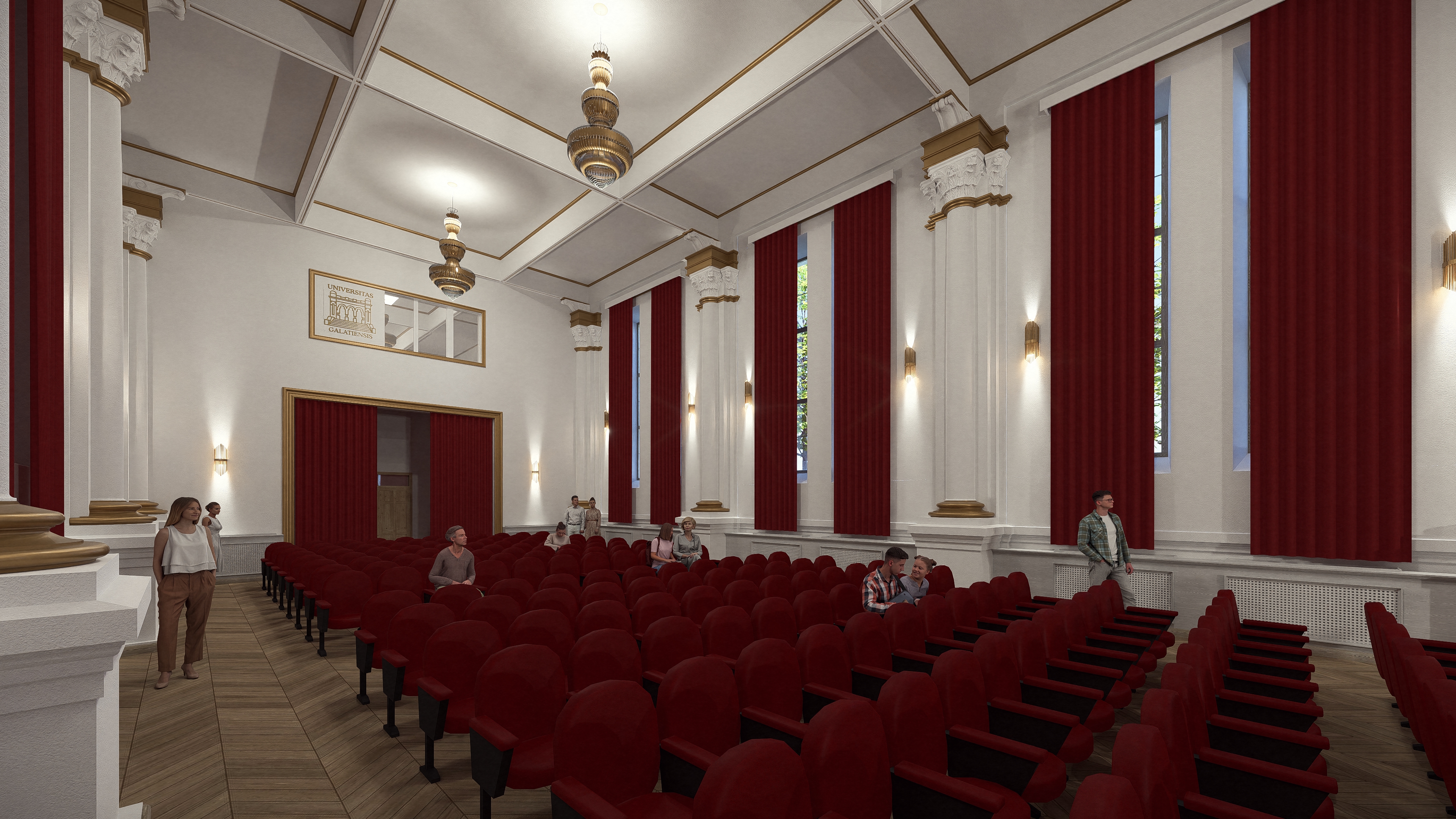 Atmosfera deosebită din Aula Magna a Universității „Dunărea de Jos” din Galaţi este accentuată prin alegerea culorii auriu, care adaugă rafinament și eleganță spațiului academic. Contrastul subtil creat între accentele aurii și tonurile neutre ale finisajelor pereților contribuie la un echilibru armonios între încărcătura istorică și modernitatea designului interior, reflectând astfel atât prestigiul, cât și spiritul contemporan al instituției.